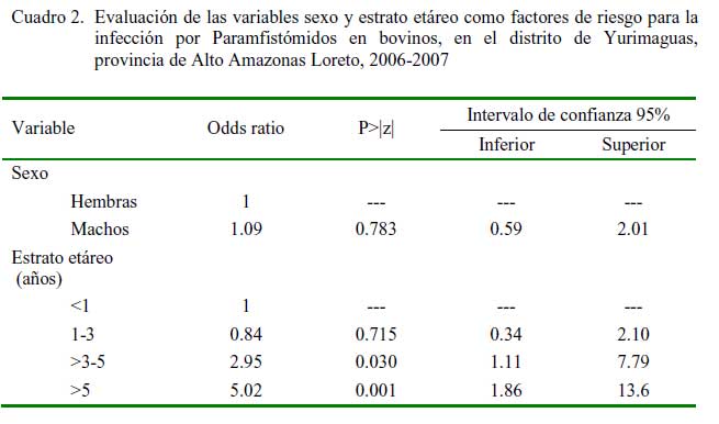 El análisis de regresión logística indicó que la variable sexo no constituyó un factor de riesgo para la presentación de la parasitosis; sin embargo, hubo asociación estadística significativa con la edad del animal, siendo los bovinos adultos (>3-5 y >5 años) más susceptibles para la presentación de los paramfistómidos (p<0.05), presentando 2.95 y 5.02 veces más riesgo de infección que los animales menores de un año (Cuadro 2).