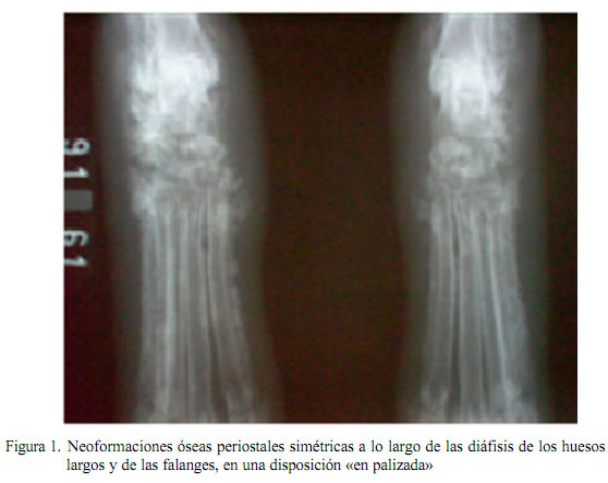 Al examen radiográfico, en la posición antero posterior de los miembros torácicos y pélvicos, se observó la presencia de neoformaciones óseas periostales simétricas a lo largo de las diáfisis de los huesos largos y de las falanges, en una disposición «en palizada» (Fig. 1). Asimismo, en la evaluación torácica lateral derecha y ventro-dorsal se observaron estructuras nodulares compatibles con neoplasia pulmonar.