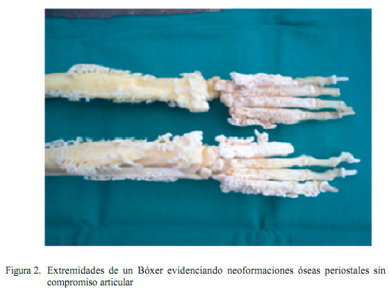Se presenta el caso de un canino Bóxer de 11 años de edad con osteopatía hipertrófica, proceso patológico óseo de escasa presentación. Se caracteriza por osteofitosis periostales bilaterales a lo largo de las diáfisis de los huesos largos y de las falanges.