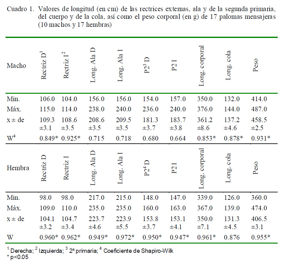 El reducido tamaño muestral se explica por la dificultad de localizar palomares de calidad con propietarios dispuestos a permitir el manipuleo de sus animales para el registro de las medidas biométricas. No obstante, el error estándar fue inferior al 6.4% para todas las variables (incluyendo el peso, variable enormemente fluctuante), por lo que se puede considerar la muestra como representativa, al menos para esta tipología funcional en las palomas.