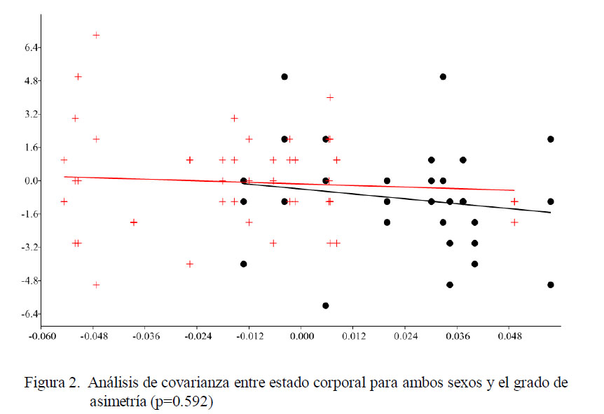 En el caso de la simetría en relación con el estado corporal, 2 machos y 12 hembras presentaron un residuo negativo, aunque en ningún caso hubo una correlación entre el estado corporal y el nivel de asimetría (Wilk’s λ=0.567, F3.6=1.526, p=0.301, y Wilk’s λ=0.909, F3.13=0.432, p=0.733 para machos y hembras, respectivamente). El análisis de covarianza no reflejó diferencias significativas entre sexos (p=0.592) (Fig. 2).