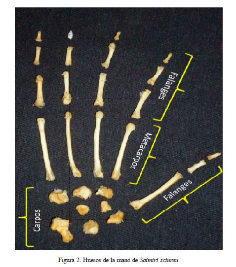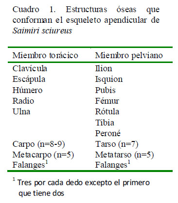 Se identificaron 130 huesos en el esqueleto apendicular de Saimiri sciureus (Cuadro 1), sin considerar los sesamoideos.