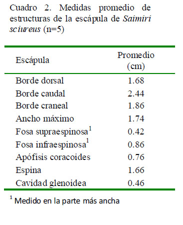 El ángulo ventral se une al cuerpo del hueso mediante el cuello de la escápula. Presenta un ensanchamiento en forma triangular hacia la parte ventral llamada cavidad glenoidea. La escápula al unirse con la cabeza del húmero forman la articulación escápulo humeral. Hacia la parte craneoventral se encuentra la apófisis coracoides, que se proyecta caudalmente con una pronunciada curvatura hacia la parte ventral. Las medidas promedio de las estructuras escapulares se encuentran en el Cuadro 2.