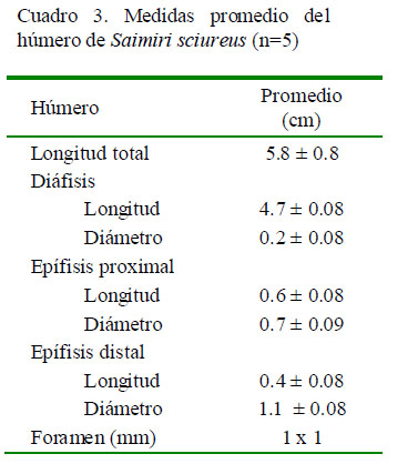Es un hueso alargado (Fig. 1B), que se extiende proximalmente desde la escápula hasta la articulación húmero-radio-cubital. Distalmente se acopla con el radio y cúbito. Consta de una diáfisis y dos epífisis. Las medidas se encuentran en el Cuadro 3.