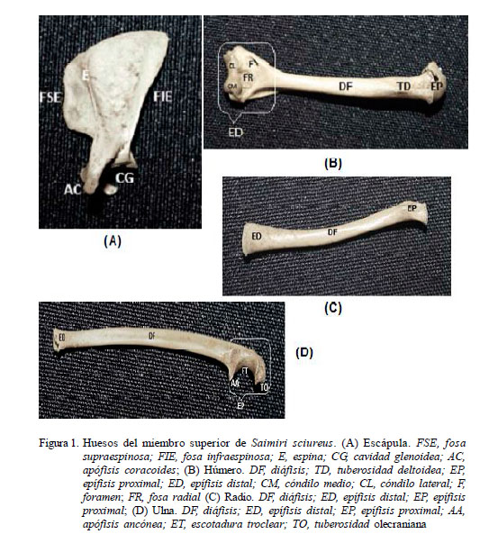 En Colombia, son pocas las experiencias en este tema. Varela (2005) describe las características externas de primates de la familia Cebidae y aspectos breves sobre los sistemas y órganos de los sentidos. Por otro lado, Defler (2010) describe aspectos taxonómicos, de comportamiento, distribución geográfica e historia natural de especies de primates neotropicales, incluyendo a S. sciureus. Es así que el presente trabajo tuvo por finalidad describir el sistema óseo correspondiente al esqueleto apendicular, como aporte importante para el estudio de la anatomía de mamíferos silvestres.