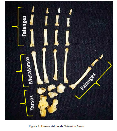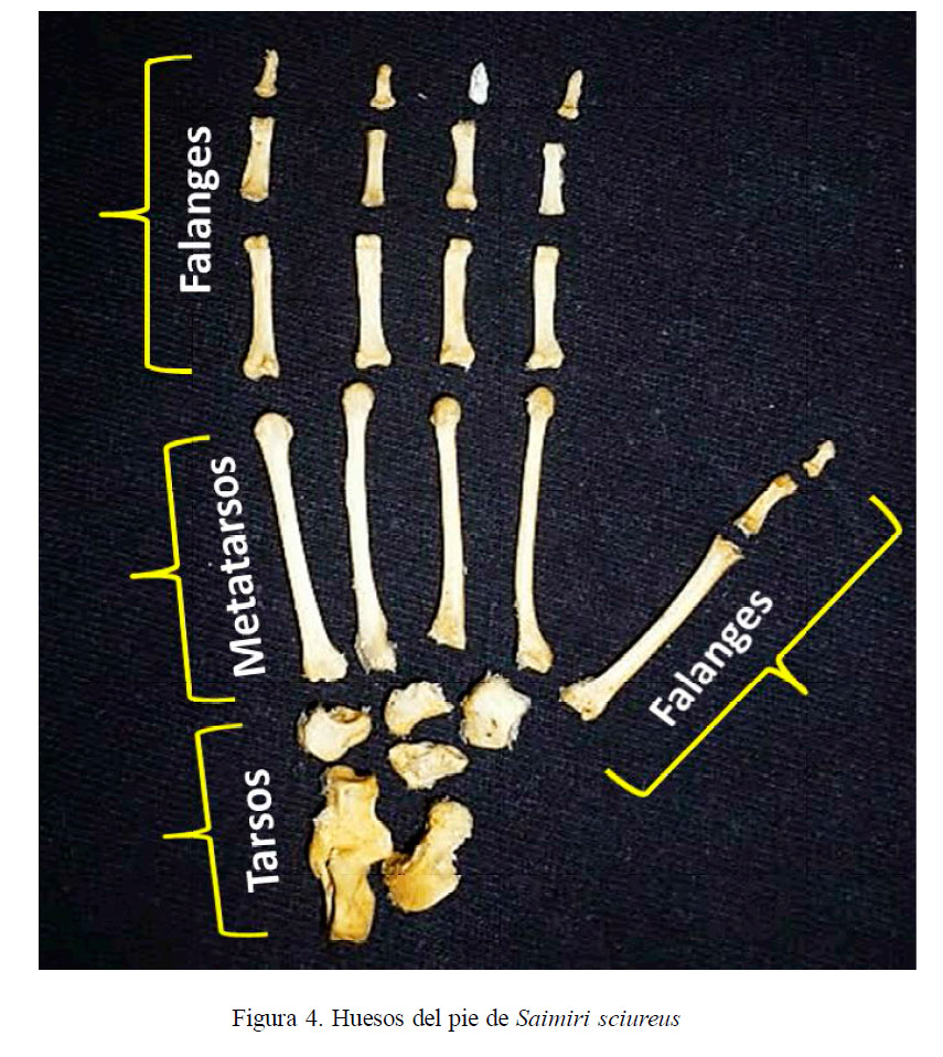 El pie del S. sciurius está compuesto por 26 huesos (Fig. 4), con una longitud promedio de 6.08 cm.