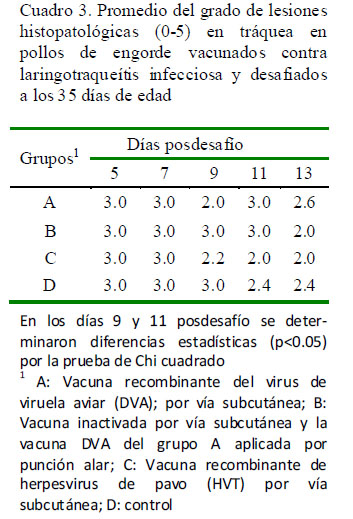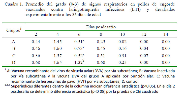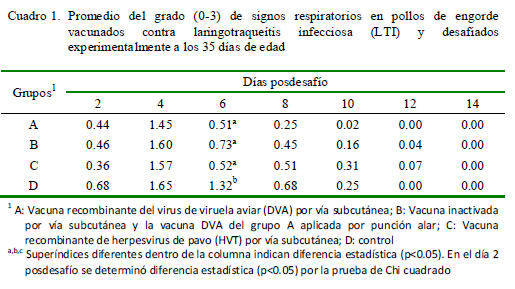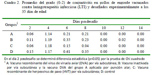 Las aves de los grupos C y D presentaron tendencias a un menor y mayor grado promedio de conjuntivitis, respectivamente (p<0.05), los días 6 y 8 posdesafío, mientras que no hubo diferencias estadísticas entre grupos los días 2, 4, 10, 12 y 14 posdesafío (Cuadro 2).