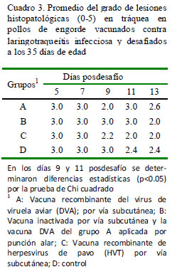 Los cuatro grupos de aves presentaron lesiones histopatológicas a partir del día 5 del desafío. Las tendencias en mayor grado de lesiones traqueales se observaron en los grupos B y D en el día 9 posdesafío y en los grupos A y B en el día 11 posdesafío; asimismo, la tendencia hacia el menor grado de lesiones ocurrió en el grupo C en el día 11 posdesafío. Por otro lado, en los días 5, 7 y 13 posdesafío no se encontraron diferencias estadísticas entre grupos (Cuadro 3). La infiltración mononuclear fue de forma difusa; sin embargo, en algunas tráqueas se presentaron, además, algunas zonas a manera de folículos, que en los casos con grado 2 eran menores que aquellos en casos con grado 3, tendendonde algunos folículos llegaron a deformar la mucosa traqueal. El grupo C presentó menor tamaño y cantidad de folículos linfoides respecto de los otros grupos. No obstante, en ningún momento se hallaron corpúsculos de inclusión ni sincitios.