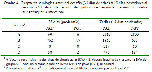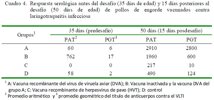 Los promedios geométricos de títulos de anticuerpos previos al desafío fueron de bajo nivel en los cuatro grupos de aves, siendo más altos en las aves del grupo B. Sin embargo, 15 días después del desafío, los grupos A y B presentaron una clara seroconversión con títulos aritméticos promedio de 2910 y 1960, respectivamente (Cuadro 4).