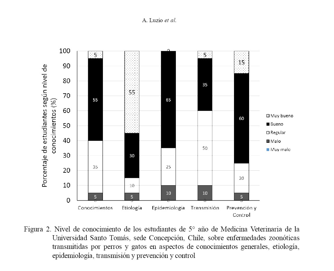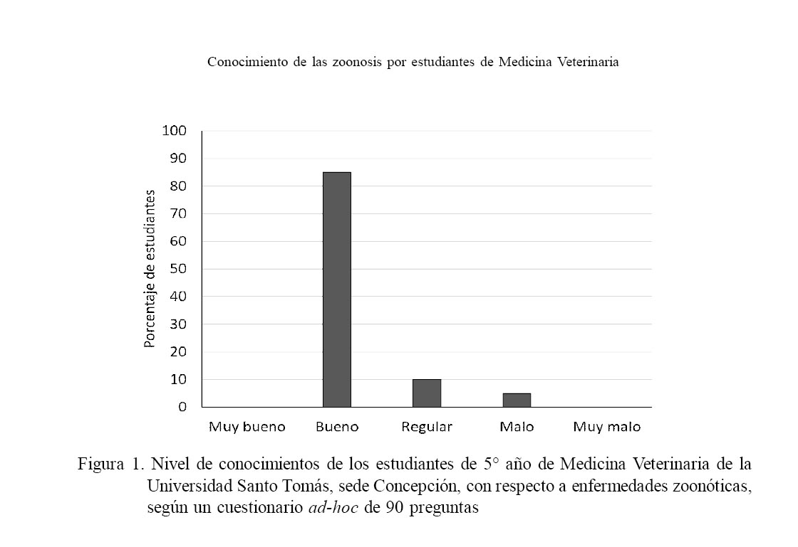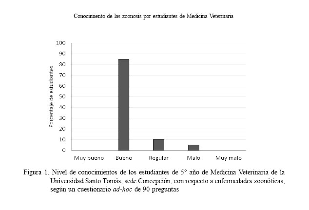 Los alumnos de quinto año de la carrera de Medicina Veterinaria de la Universidad Santo Tomás, Chile, poseen un adecuado conocimiento de las enfermedades zoonóticas prevalecientes en el país, especialmente en lo concerniente a su etiología.