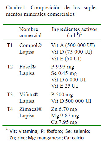 Se utilizaron 48 ovejas Pelibuey Canelo (n=26) y Katahdin (n=22), con 2.5 ± 0.5 años de edad media, 45.0 ± 5.0 kg de peso promedio y 2.5 a 4.0 de condición corporal (escala de 1 a 5). Se seleccionaron tomando en cuenta su historial reproductivo, con la finalidad de que fueran fértiles y con buena habilidad materna. Se distribuyeron de manera aleatoria en cuatro tratamientos a base de un suplemento mineral parenteral: T1 = Compol® (2 ml animal-1) como grupo control; T2 = Fosel® (2 ml animal-1); T3 = Vifato® (10 ml animal-1) y T4 = Zimacal® (3.5 ml animal-1). La composición química de los suplementos minerales se muestra en el Cuadro 1.
