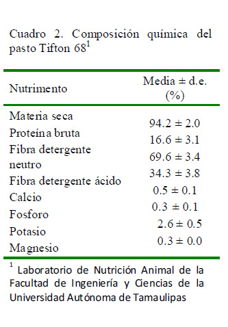 La alimentación de los cuatro grupos experimentales de borregas fue al pastoreo en pradera de zacate bermuda Tifton 68 (Cynodon nlemfuensis), durante las estaciones de primavera, verano y otoño (Cuadro 2), en tanto que la alimentación en la época de invierno se realizó en corral con una dieta balanceada al 7% de proteína bruta (PB) y 2.4 Mcal de energía metabolizable (EM) a base de cáscara fresca de cítricos, suplemento proteico y agua a libre acceso. La alimenta ción b as al cub ría los requ er imient os nutricionales de una dieta de mantenimiento y de acuerdo a la etapa fisiológica de las ovejas (empadre; NRC, 2007), aunque no se pudo determinar los niveles de Cu, Fe y Zn proporcionados por las pasturas ni por la dieta de invierno.