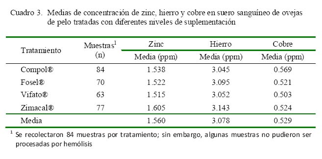 La concentración de los niveles de Zn en suero sanguíneo en ovejas oscila en un rango de 0.9 a 2.0 mg L-1 (Underwood y Suttle, 2003). La concentración promedio de Zn en la presente investigación fue de 1.56 ppm, sin diferencia estadística entre tratamientos, y se mantuvieron dentro del rango aceptado (Valle et al., 1997). Cabe señalar que los niveles de Zn pudieran deberse al adecuado contenido de nutrientes de la dieta basal, debido a que las reservas de este mineral son escasas (Millar et al., 1986).