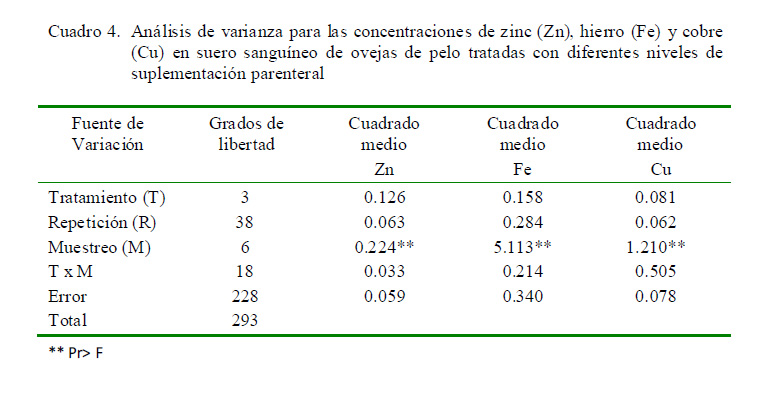 En forma similar a las concentraciones de Zn y Cu, las concentraciones de Fe en suero sanguíneo de borregas no se vieron afectadas por los tratamientos ni por la interacción tratamiento x periodo de muestreo; sin embargo, hubo diferencias significativas (p<0.05) entre los periodos de muestreo.