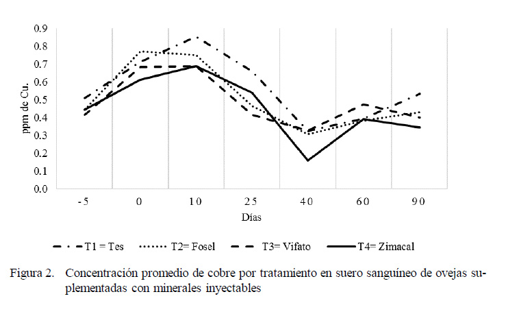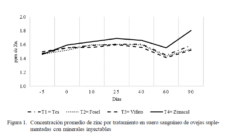 En la Figura 1 se muestra el comportamiento de las concentraciones de los niveles séricos de Zn. Los animales de cada tratamiento mostraron niveles aceptables de Zn cinco días previos a la suplementación, con una variación de 1.459 a 1.497 ppm. La concentración tuvo una tendencia creciente, con excepción del día 60, donde se apreció una disminución en todos los tratamientos, sin que existiera una explicación lógica, dado que para el siguiente muestreo (día 90) volvieron a incrementarse los niveles de Zn.