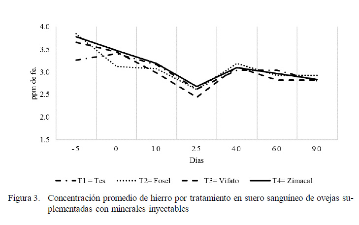 La media de concentración de Fe en sangre fue de 3.078 ppm, resultado similar al mencionado por Valle et al. (1997). El nivel sérico antes del inicio de la aplicación de los tratamientos (día -5) fue elevado, pero se observó una disminución persistente durante el estudio en los niveles séricos de Fe, a pesar de los tratamientos efectuados (Figura 3).