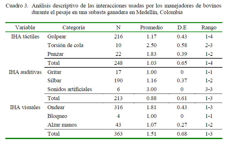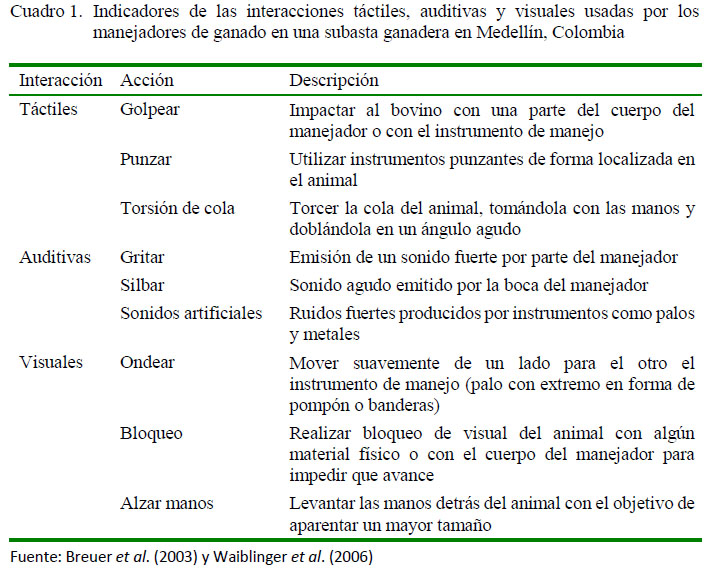 Así mismo, se incluyeron las posturas agresivas de los animales frente a los manejadores (Cuadro 2) cuando se observaron los patrones de varias conductas en una sola interacción, de acuerdo con los lineamientos dados por Horwitz et al. (2002), pero adaptados a la especie bovina y a las características comerciales de la subasta; debido a esto, se disminuyeron los tiempos de observación y no se establecieron tiempos de adaptación. En el momento en que el manejador conducía, separaba o movía un lote durante el pesaje o un grupo de varios lotes durante la conducción a los corrales, se observaba durante 30 segundos la interacción que el manejador empleaba y por 10 segundos la respuesta conductual bovina (Breuer et al., 2003; de Vries, 2011; Cobo, 2013).