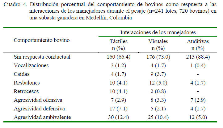 La mayor proporción de bovinos no presentaron respuestas conductuales a las interacciones usadas por los manejadores durante el pesaje y las respuestas observadas presentaron coeficientes de correlación de Pearson débiles (r<0.27). La agresividad ambivalente fue la respuesta más frecuente (Cuadro 4).