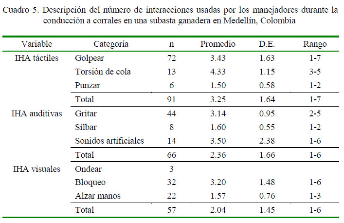 En la conducción a los corrales de alojamiento se observaron 28 grupos (n=720 bovinos), con un promedio por grupo de 25.2 ± 16.3 (rango 3-67). Se registraron 214 interacciones, de las cuales predominaron las táctiles (42.5%), seguidas de las auditivas (30.8%) y las visuales (26.6%) (Cuadro 5).