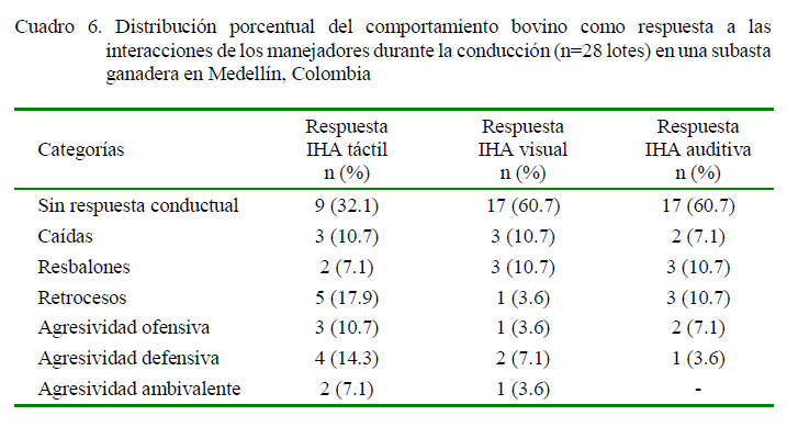 Los lotes de animales durante el pesaje fueron pequeños y, en su mayoría, provenían del mismo grupo social; aspecto que podría explicar las pocas respuestas conductuales a las interacciones auditivas y visuales, que facilitaron el manejo de los lotes en esta área (de Vries, 2011). Sin embargo, las respuestas conductuales agonísticas fueron mayores que aquellas reportadas en plantas de beneficio colombianas (Cobo, 2013), pero se encuentran acordes con autores que evaluaron la IHA en subastas chilenas (de Vries, 2011).