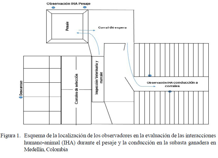 La evaluación de la interacción IHA se realizó por cuatro observadores entrenados, sin interferir con la rutina normal de trabajo, durante el pesaje y la conducción de los bovinos, usando la metodología descrita por Breuer et al. (2003) y Waiblinger et al. (2006), pero adaptado a la especie bovina y a las características comerciales de la subasta; debido a esto, se disminuyeron los tiempos de observación y no se establecieron tiempos de adaptación. Durante el pesaje, se ubicaron dos observadores, donde cada uno evaluó el desempeño de un manejador, desde el momento en que se abrió la puerta del embudo de inspección para conducir el lote al corral de pesaje hasta que el último animal del lote salió del corral de pesaje e ingresó al corral de espera. Así mismo, durante la conducción se ubicaron dos observadores, donde cada uno realizó la evaluación a un manejador, desde el momento en que conducía, separaba o movía el grupo de varios lotes bovinos, hasta que estos ingresaban a los corrales de alojamiento (Figura 1).