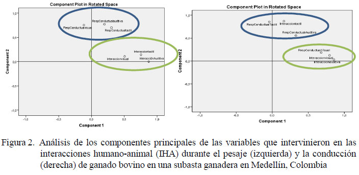 El análisis de componentes principales identificó dos componentes que definieron la IHA de los lotes durante el pesaje. Estos componentes explicaron el 57.1% de la varianza del constructo, resultado adecuado y estadísticamente significativo (KMO=0.57; Prueba de Bartlett´s X2=230.24; valor P=0.000). La confiabilidad del constructo fue determinada mediante el cálculo del alfa de Cronbach 0.61. El primer componente lo conformaron las interacciones táctiles, auditivas y visuales de los manejadores, definidas para este estudio como «conducta de los manejadores» y el segundo componente conformado por la respuesta conductual de los bovinos, definida como «conducta de los bovinos», todas con correlaciones fuertes y directas (Cuadro 7) (Figura 2).