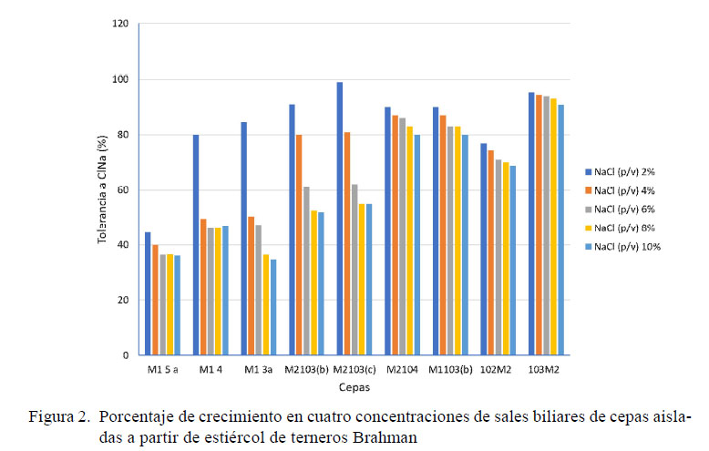 La mayor tolerancia frente al cloruro de sodio la presentó la cepa 103M2 con valores superiores a 90%, en tanto que la cepa M2103c presentó valores superiores al 50% en las cuatro concentraciones. Por otro lado, la cepa M13a disminuyó el crecimiento con el incremento de la concentración de NaCl (Figura 3). Estos resultados se deben a que la mayoría de las bacterias son relativamente insensibles a las variaciones de la presión osmótica y se adaptan a cambios fuertes en la concentración de solutos del medio, dado que poseen una pared celular mecánicamente rígida (Hernández, 1992).