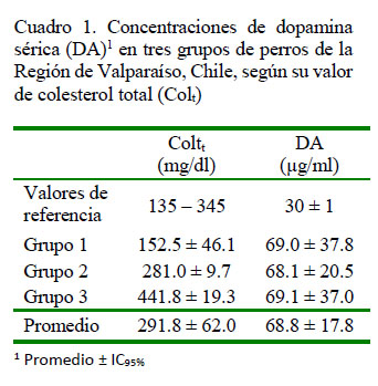 Se investigó la relación entre el colesterol total (Colt) y la dopamina (DA) a fin de disponer de un examen accesible en consulta como es la medición del colesterol total (Colt) de manera de proyectar el comportamiento de la DA sérica. Se determinó el Colt a 50 caninos y sobre la base de los resultados se formaron tres grupos estudio, Grupo I: 6 pacientes con Colt entre 77 y 200 mg/dl; Grupo II: 6 pacientes entre 250 y 300 mg/dl; Grupo III: 6 pacientes entre 400 y 470 mg/dl. A los 18 pacientes se les midió la DA sérica a través de HPLC acoplado a un detector electroquímico. Se encontró una amplia distribución de datos respecto de la determinación de Colt (291.8 ± 62.0 mg/ dl) y DA (68.8 ± 17.8 µg/ml) con una baja correlación entre ellos. El análisis por grupo de estudio muestra una mayor correlación de DA para bajas concentraciones de colesterol sérico, y el análisis de pendientes muestra que la variación en la concentración de DA es mayor ante pequeñas variaciones de colesterol en el grupo II.