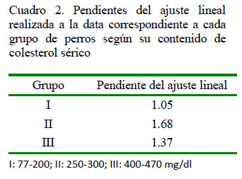 En el análisis de las pendientes de las rectas de cada grupo de estudio se puede observar una mayor pendiente en el grupo II; es decir, aun cuando este grupo tiene un menor nivel de asociación entre las variables, pequeñas variaciones en el contenido de colesterol sérico aumentan el contenido de DA, o al menos, en mayor medida, al compararse con los grupos I y III.