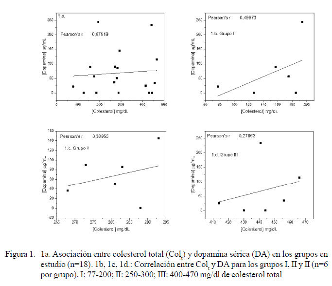 Existe una amplia distribución de valores en colesterol total (COLt) y dopamina (DA) sérica en perros, con una baja correlación entre estas variables.