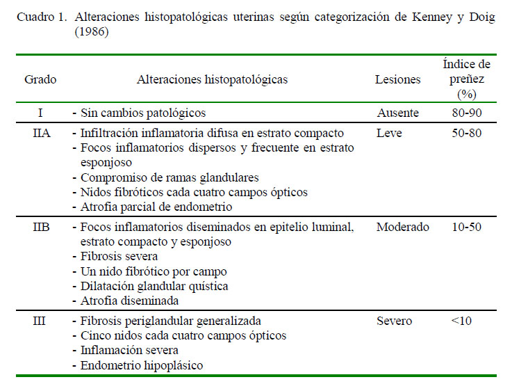 Se evaluó el grado de fibrosis periglandular, pleomorfismo de células epiteliales, infiltración de células inflamatorias y conformación de nidos glandulares. Las muestras fueron clasificadas a doble ciego según la escala descrita por Kenney y Doig (1986), la cual reconoce cuatro grupos en escala ascendente según número e intensidad de las alteraciones (I, IIA, IIB y III) (Schlafer, 2007). Ver Cuadro 1. Los resultados en este estudio fueron agrupados en dos categorías: útero normal: I y IIA; útero patológico: IIB y III.