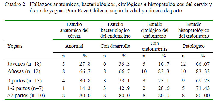 The objective of this study was to evaluate the uterine integrity of Purebred Chilean mares in relation to age and parity number. A total of 30 mares stratified according to age (young: 2-12 years, elder: >12 years) and parity (0, 1-2,> 2 parturitions). The integrity of the cervix was evaluated, and biopsies were performed for cytology and microbiological culture of the endometrium. Results showed that 73.3% of the mares had histopathological alterations without statistical association with age and parity. The uterine cytology showed that 43.3% of the mares had endometritis, a condition that showed significant association with age and parity. Escherichia coli was isolated in 8 of the 10 cases of bacterial endometritis of the study. Also, 13 mares presented abnormalities of the cervix, which was associated with age and parity. The results indicated that the age and parity number are factors that should be considered when evaluating the potential fertility of Purebred Chilean Mares.