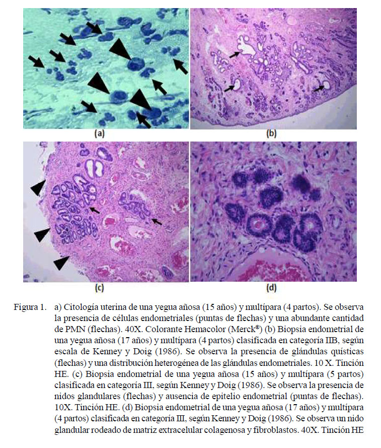 Los hallazgos histopatológicos del útero concuerdan con las descritas por Schlafer (2007) y Castañeira (2009) para otras razas de equinos; es decir, pleomorfismo de células epiteliales, fibrosis periglandular, glándulas quísticas, nidos glandulares, lagunas linfáticas e infiltración de células inflamatorias.