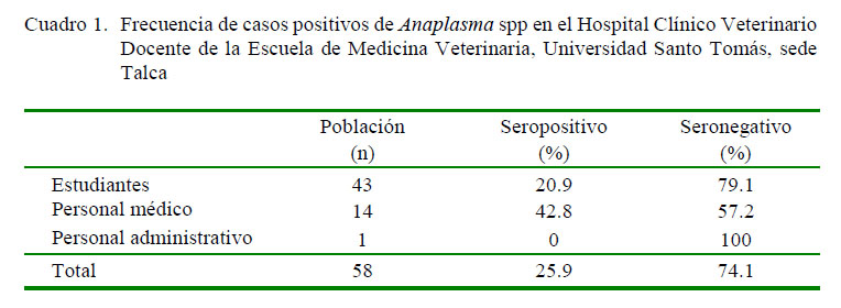 Los resultados indican seropositividad de 25.9% a A. phagocytophilum en estudiantes y personal médico veterinario en el HCVD UST; datos concordantes con investigaciones realizadas en Chile, que indican que el principal grupo de riesgo para adquirir este tipo de patógeno es el personal médico, administrativo y de peluquerías de clínicas veterinarias (Abarca et al., 2008). Los resultados actuales son mayores al 18.5% descrito para Santiago de Chile (Abarca et al., 2008), posiblemente debido a que los propietarios de mascotas asistían a clínicas privadas en la capital, mientras que la población analizada en este estudio fueron personas que atendían mascotas de propietarios de estrato socioeconómico bajo, por ende, con menor posibilidad de realizar un efectivo tratamiento contra ectoparásitos (Weinborn, 2013). Además, la población estudiada en HCVD tiene mayor contacto diario con caninos con y sin dueño pudiendo, por lo tanto, tener un mayor contacto con ectoparásitos portadores del patógeno.