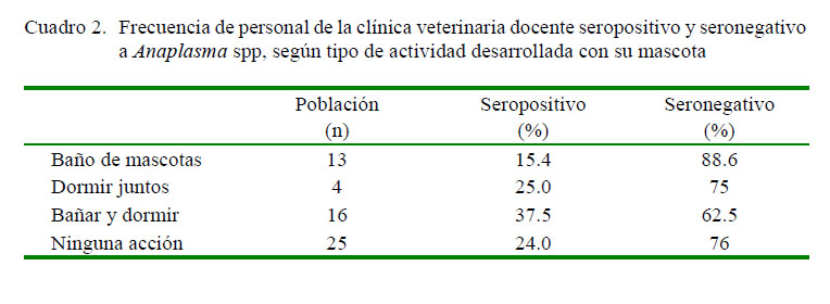 En el Cuadro 2 se muestra la seropositividad de las personas para Anaplasma spp según el tipo de actividad desarrollada con su mascota. Destaca el caso de los dueños que bañaban y dormían con las mascotas (37.5%). No existieron diferencias significativas entre seropositivos y seronegativos, con excepción de la actividad de dormir juntos y con aquellos que no tenían estos tipos de interacción con las mascotas (p<0.05).