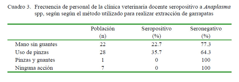 Todos los que usaban pinzas y guantes para la extracción de las garrapatas o aquellos que no participaban en la extracción de garrapatas fueron seronegativos para Anaplasma spp (Cuadro 3). Se encontró diferencia significativa entre seropositivos y seronegativos para el grupo que extraía las garrapatas con la mano sin guantes (p<0.05).