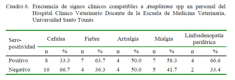 En cuanto a las manifestaciones clínicas compatibles a anaplasmosis, nueve sujetos seropositivos y 17 seronegativos tuvieron alguna signología clínica compatible con la enfermedad, sin evidenciar diferencias significativas. Entre los signos más frecuentes se encuentran la cefalea y la fiebre (Cuadro 6); sin embargo, al evaluar la concordancia entre los resultados de la prueba IFI y la signología sugerente a Anaplasma spp, el resultado del índice Kappa fue (K)=0.13, indicando que la concordancia fue considerada como insignificante.