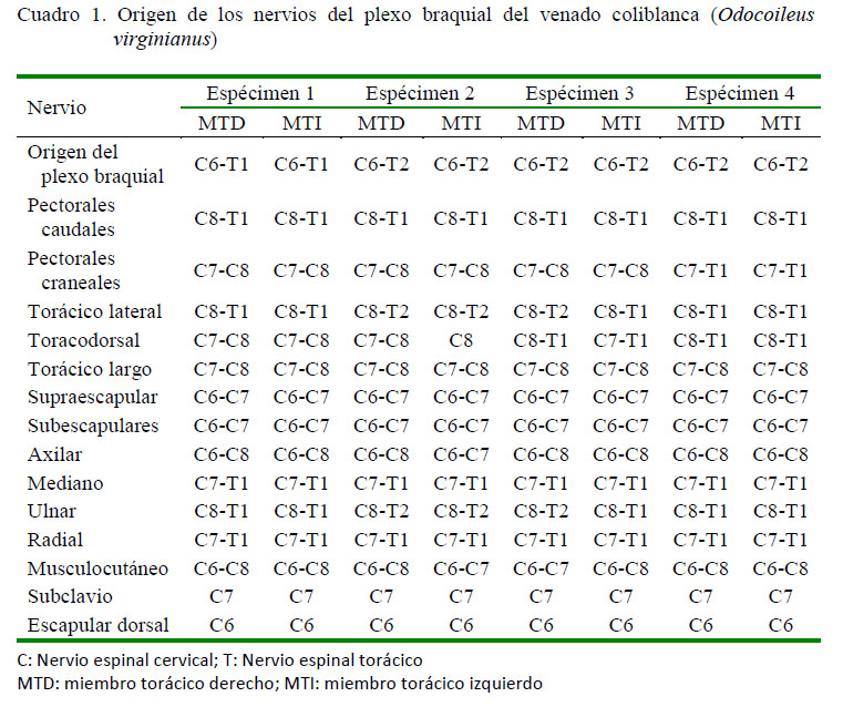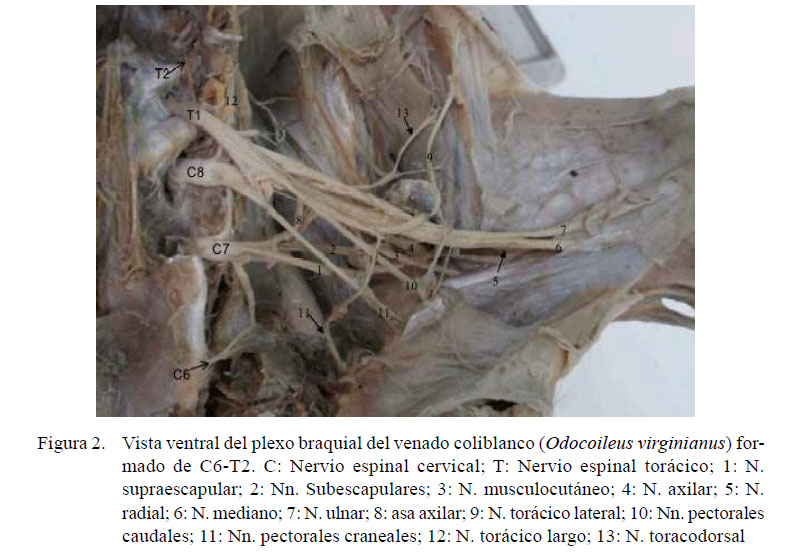 Las raíces del plexo braquial en el bovino provienen de los ramos ventrales de C6 a T2 (Magilton, 1966; Ghoshal, 1982; Budras et al., 2011, Dyce et al., 2012), siendo similar a lo encontrado en la mayoría de especímenes de O. virginianus, aunque uno presentó origen de C6-T1, similar al guazuncho (Mazama gouazoubira) (Meloet al., 2007, Vieira et al., 2013), okapi (Okapia johnstoni) (Endo et al., 2009), serau japonés ( Capricornis crispus) (Atoji et al., 1987), ovinos y caprinos (May 1974; Ghoshal 1982; Karim et al., 2008; Barone y Simoens, 2010), aunque en estos tres últimos pueden haber casos excepcionales donde hay contribución de T2 (Barone y Simoens, 2010), lo cual también puede acontecer en el bovino (Barone y Simoens, 2010) y en O. virginianus.