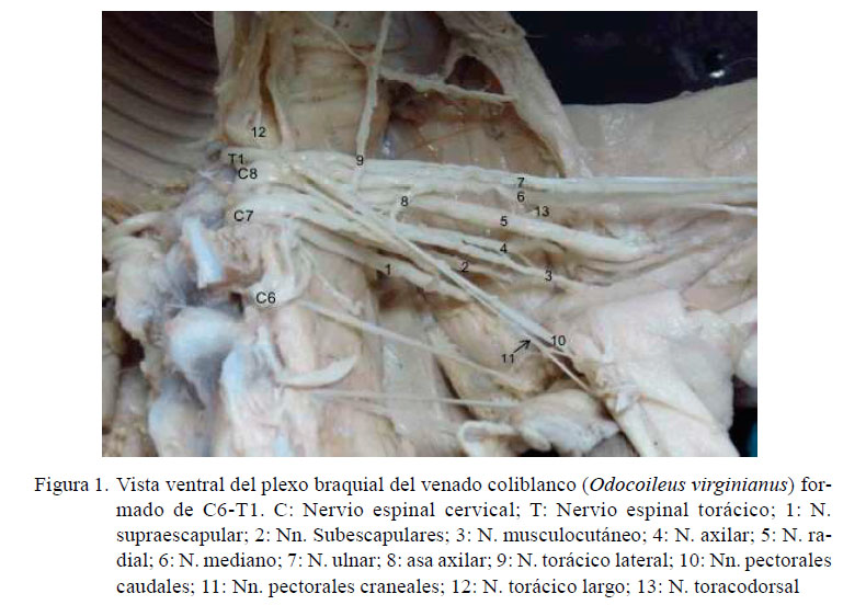 La parte somática del sistema nervioso hace posible la interacción del cuerpo con el ambiente externo e interno. Estas funciones se llevan a cabo en el miembro torácico mediante el plexo braquial, el cual se forma por la confluencia de los ramos ventrales de los tres últimos nervios cervicales y el primer nervio torácico (C6, C7, C8 y T1), y algunas veces con contribución del quinto nervio cervical (C5) y el segundo nervio torácico (T2) (Barone y Simoens, 2010; Dyce et al., 2012). En la práctica de anestesia, este plexo se puede ubicar mediante ultrasonido en el bovino (Iwamoto et al., 2012) o con un estimulador nervioso para aplicar anestésicos que bloqueen su conducción nerviosa en ovejas (Ghadirian y Vesal, 2013). Estas técnicas podrían ser empleadas en cérvidos bajo anestesia general, ya que esta y la cirugía en venados, es similar a la utilizada en los bovinos (Duarte et al., 2001). No obstante, un mejor conocimiento de la anatomía de cada especie permite establecer mejores procedimien-tos anestésicos regionales y quirúrgicos, pues toman en cuenta las variantes anatómicas.