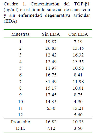 La enfermedad degenerativa articular (EDA) es una patología de carácter no inflamatorio en su origen, que se caracteriza en ser progresiva, estructural y funcional. El factor de crecimiento transformante Beta 1 (TGF-β1) es una citocina reguladora en la producción y depósito de matriz extracelular en varios tejidos, incluyendo el cartílago articular. El objetivo del presente estudio fue comparar las concentraciones del factor de crecimiento transformante β1 en líquido sinovial de caninos con (n=12) y sin EDA (n=11), determinado mediante una prueba de ELISA. La concentración media de TGB-β1 en perros sin EDA fue de 16.8 ± 7.1 ng/ml, mientras que en perros con EDA fue de 10.3 ± 3.5 ng/ml (p<0.05).