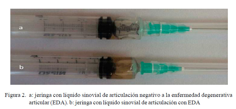 El líquido sinovial se extrajo de codo, cadera o rodilla, según la articulación afectada, con una jeringa de 10 ml con aguja de 18G, que se introdujo en la articulación para aspirar el fluido en forma aséptica (Figura 1). Se tuvo en cuenta que la presión negativa de la jeringa fuese liberada antes del retiro de la aguja de la articulación para evitar contaminación de la muestra (Figura 2). Esta fue depositada en un tubo con EDTA y centrifugada a 1500 rpm (101 g) por 5 minutos (Fischer et al., 2014). Para la determinación de TGF-β1 se empleó la técnica cuantitativa de inmunoensayo enzimático con un kit comercial específico para caninos (Quantikine® ELISA, Mouse/Rat/Porcine/ Canine TGF β1 Inmunoassay).