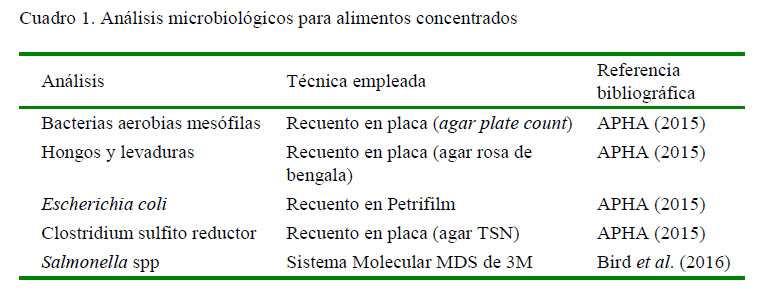 Por último, todas las muestras cumplieron con los límites permitidos en la legislación colombiana sobre los otros grupos indicadores analizados (recuento de bacterias mesófilas, recuento de hongos y levaduras y recuento de Clostridium sulfito reductor), sugiriendo un control adecuado en el proceso de elaboración de los concentrados, de allí que la pérdida de la calidad se daría en el manejo en granja.