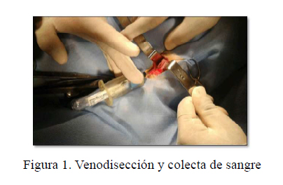 Los animales fueron pre-medicados con cefalexina 25 mg/kg y meloxicam 0.2 mg/kg vía intramuscular 30 min antes del procedimiento quirúrgico. La anestesia fue inducida con xilacina 2 mg/kg y ketamina 6 mg/kg vía intravenosa. Siguiendo la metodología descrita en Bonilla et al. (2017), 2 ml de lidocaína al 2% fueron infiltrados en el tejido subcutáneo adyacente a la vena yugular. Se hizo una incisión longitudinal en la piel a nivel del surco yugular, el músculo cutáneo del cuello fue incidido y desplazado lateralmente, permitiendo la visualización de la vena yugular externa. Se colectó sangre por medio de dos tubos vacutainer de 3.5 ml cada uno, estériles, con citrato de sodio al 3.2% como anticoagulante (VACUETTE® Greiner-Bio-One, Austria) (Figura 1).