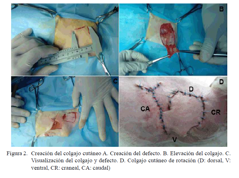 El área toraco-dorsal del miembro torácico derecho fue rasurado. El procedimiento quirúrgico fue realizado bajo condiciones asépticas. Las zonas por incidir fueron infiltradas con 2 ml de lidocaína al 2%. Se obtuvo un colgajo de rotación rectangular de 5x3 cm. El defecto fue visualizado como un cuadrado de 3 cm ubicado 4 cm caudal al acromion. Una vez rotado el colgajo sobre la lesión fue suturado con hilo de polipropileno (Prolene® Ethicon, Johnson & Johnson) 3/0 en puntos simples separados (Figura 2).