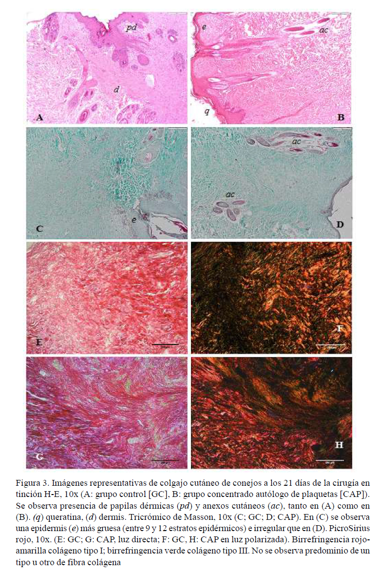 Se ha demostrado que los derivados hemáticos como el CAP pueden promover la formación de colágeno, especialmente tipo I y tipo III a través de la expresión del gen de la proteína de matriz del fibroblasto (Xian et al., 2015). En este estudio, los tejidos coloreados con PicroSirius rojo y observados bajo polares cruzados mostraron birrefringencia mixta en los grupos experimentales, siendo difícil determinar el predominio de colágeno tipo I o tipo III. Durante el proceso de cicatrización el colágeno tipo III se produce rápidamente para formar una barrera de fibras delgadas y débiles en el área de la lesión (Gurtner et al., 2008; Wong et al., 2013), el cual es degradado por las proteasas producidas por los fibroblastos para formar colágeno tipo I que proporciona una mayor resistencia a los tejidos (Witte y Barbul, 1997; Bainbridge, 2013).