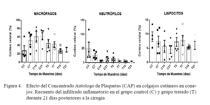 El estudio histológico demostró marcado infiltrado inflamatorio en las etapas iniciales, disminuyendo a lo largo del tiempo experimental en el grupo control. Lo anterior coincide con los resultados del análisis morfométrico evidenciando mayor infiltración celular, principalmente de tipo polimorfonuclear, en GC comparado con GCAP. Estos hallazgos son similares a los reportados en Bonilla (2016), al observar recuentos mayores de neutrófilos en heridas dérmicas en conejos 3 y 7 días después de realizada la lesión. En colgajos de patrón aleatorio tratados con CAP, Wang et al. (2016) cuantificaron menor cantidad de células inflamatorias en muestras colectadas 3 y 7 días después de la intervención quirúrgica. Se ha descrito que las plaquetas producen el factor de crecimiento de hepatocitos (HGF), un factor pleiotrópico que inhibe la función del factor de transcripción nuclear kappa beta (NF-κβ), principal regulador del proceso inflamatorio (Bendinelli et al., 2010; Boswell et al., 2012).