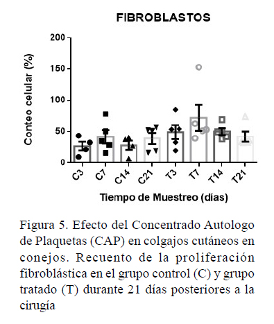 La cicatrización de las lesiones cutáneas está regulada principalmente por la acción de los fibroblastos, promoviendo la formación de matriz extracelular (Madden y Peacock, 1971; Reinke y Sorg, 2012). La evaluación histológica de las microfotografías permitió observar una mayor concentración de fibroblastos en el grupo CAP, principalmente en el día 14 posquirúrgico, mostrando fibras de colágeno densas en la dermis reticular en las etapas finales del proceso de reparación. Resultados similares reportaron Bertone et al. (2016) al evidenciar proliferación significativa de fibroblastos 15 y 30 días posquirúrgico en colgajos de avance tratados con plasma rico en factores de crecimiento.