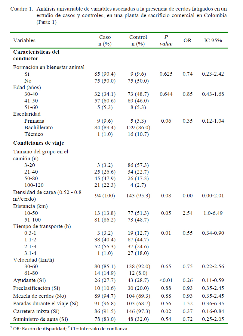 El objetivo del presente estudio fue determinar los factores de riesgo asociados con la presencia de cerdos fatigados durante el transporte y sus implicaciones en el pH muscular alto en cerdos de ceba comercial. Se realizó un estudio de casos y controles, que incluyó 94 cerdos fatigados como casos y 94 cerdos típicos como controles. Los cerdos utilizados en este estudio eran machos castrados y hembras jóvenes de un genotipo comercial y peso de mercado estándar (115.5 ± 1.3 kg en promedio). Se aplicaron encuestas estructuradas para caracterizar las condiciones de transporte y se evaluó el pH45 y pH24 de las canales. El modelo de regresión logística mostró que el número de compartimientos, la presencia de asistente, el sexo, la velocidad y el tiempo de transporte fueron variables asociadas con la presencia de cerdos fatigados. Los cerdos fatigados presentaron mayor probabilidad de pH muscular alto que los cerdos normales (p<0.01). Estos resultados indican que el transporte es un factor de estrés para los cerdos con implicaciones sobre la presencia de cerdos fatigados y carne con pH24 alto.