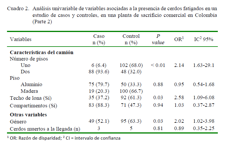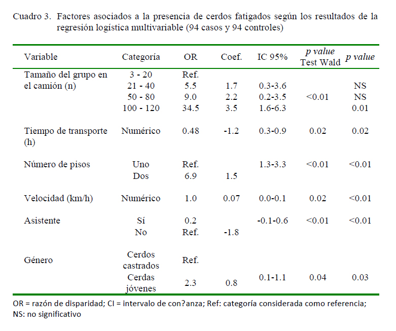 En el análisis de regresión logística univariable se identificaron diferencias significativas entre los casos y los controles para nueve variables (Cuadros 1 y 2). El modelo de regresión logística mostró que el número de compartimientos del camión, la presencia de un ayudante durante el viaje, el sexo de los cerdos, la velocidad y el tiempo de transporte fueron variables asociadas con la presencia de cerdos fatigados (p<0.05) (Cuadro 3).