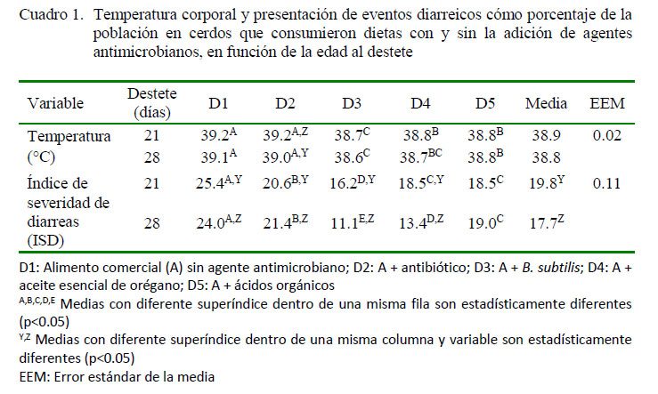 Los resultados de las variables clínicas se muestran en el Cuadro 1. No hubo diferencia significativa para la variable temperatura entre las dietas D1 y D2, pero mostraron valores más altos con respecto a las otras dietas (p<0.05), tanto en los lechones destetados a los 21 como a los 28 días; sin embargo, no se evidenció diferencia estadística para la variable temperatura por efecto de la edad de destete en general.